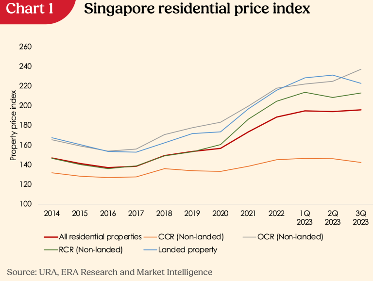 Landed home prices remained steady, registering a modest 3.2% increase over the last nine months of 2023. This contrasts with the preceding two years, where the COVID-induced boom propelled landed prices to surge by 13.3% and 9.6% year-on-year in 2021 and 2022, respectively.